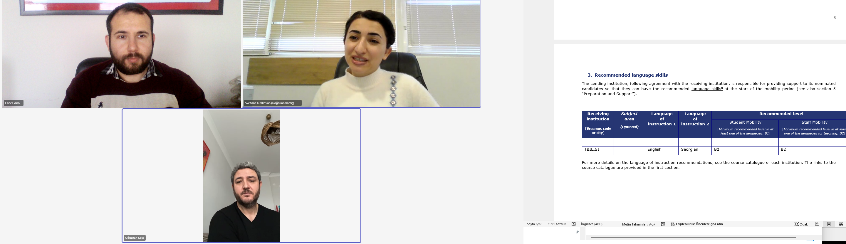 MoU'yu takiben, iş birliğinin somutlaştırılması amacıyla Teams platformu üzerinden çevrim içi bir toplantı düzenlendi. Toplantıda, Erasmus+ Küresel Hareketlilik (KA171) faaliyeti kapsamında öğrenci ve personel değişimi için imzalanacak olan İkili Anlaşma'nın detayları görüşüldü.